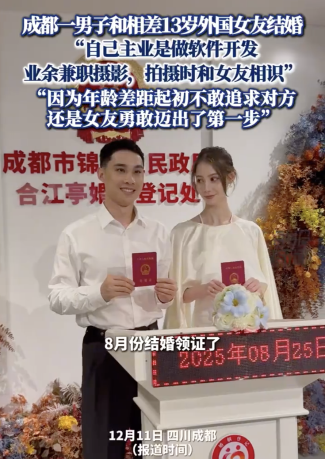 近期,成�岁的杜先生与�岁的外国女友结婚的消息,引发不少关注。杜先生主业是软件开发,平时喜欢摄影,还兼职做相关工作,两人的缘分就始于一次拍摄。当时女方作为模特来中国工作,杜先生负责拍摄,相处中他对这个活泼开朗的外国女孩产生了好感,但想�岁的年龄差距,他一直没敢表白。没想到是女孩主动迈出了第一步,捅破了这层窗户纸。